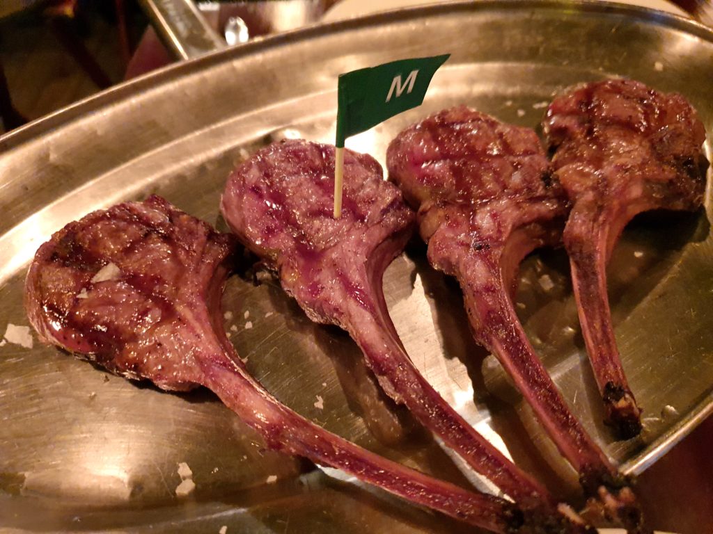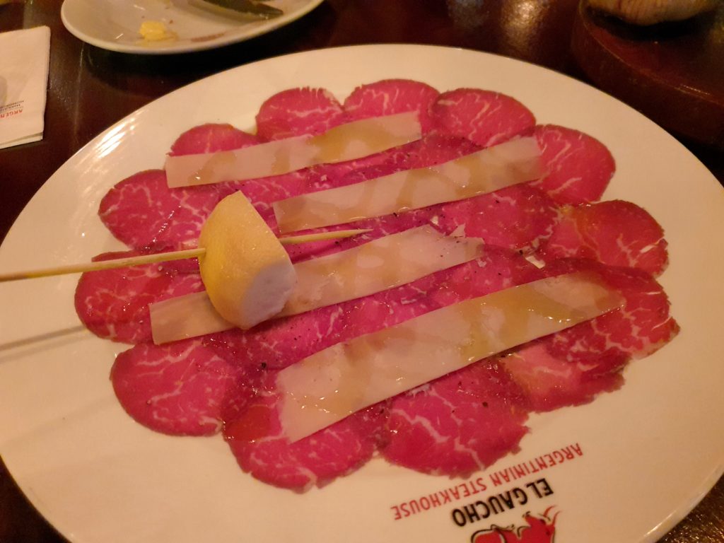 続いて、カルパッチョ、リブアイとラムが出て来ました。シェアしたいとお願いすると人数分に分けてくれます。写真を撮りたい場合は、切り分ける前がベストショットです。