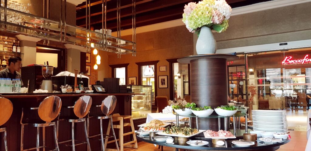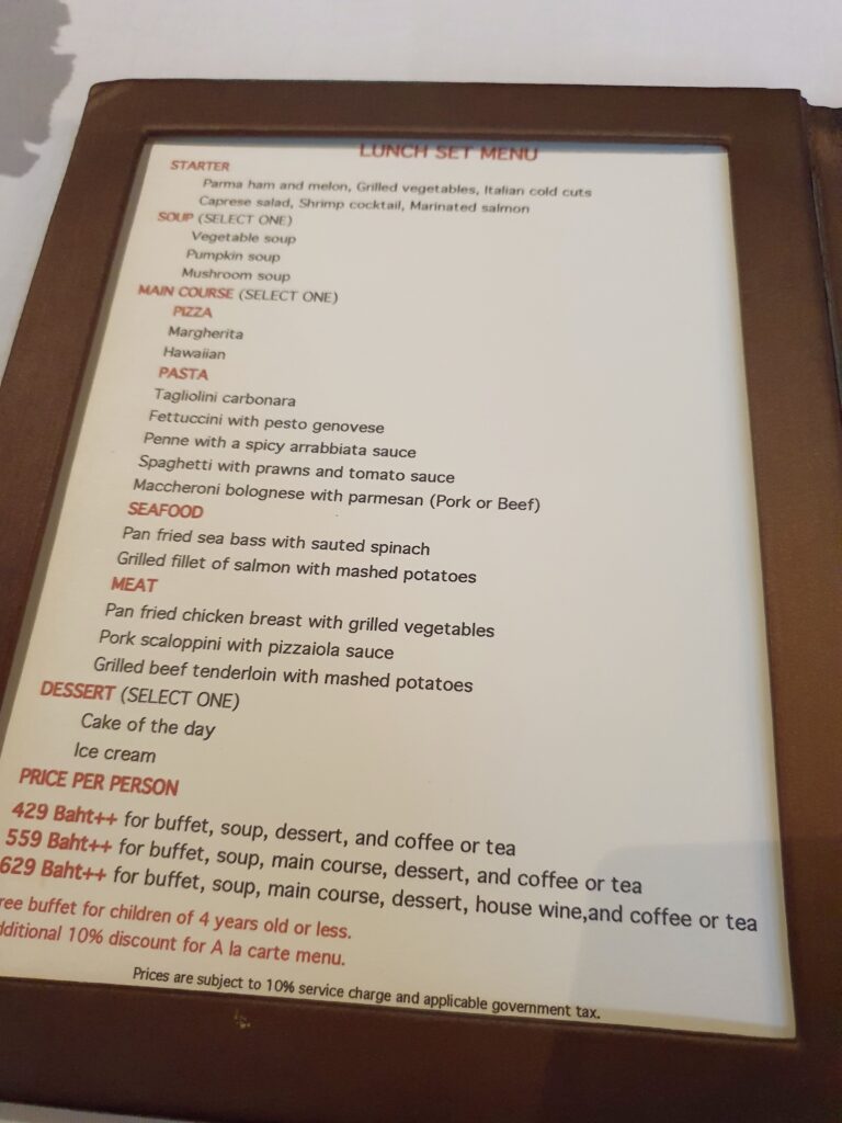 お値段はビュッフェの時と変わらず3種類のコースから選べる形となっておりVATとサービスチャージは別途となるので、メインのついた真ん中のコースだと2人で1,300バーツ程(約4,500円)でした。祝日のランチタイムに行ったせいか思った以上にお客さんが入っていました。