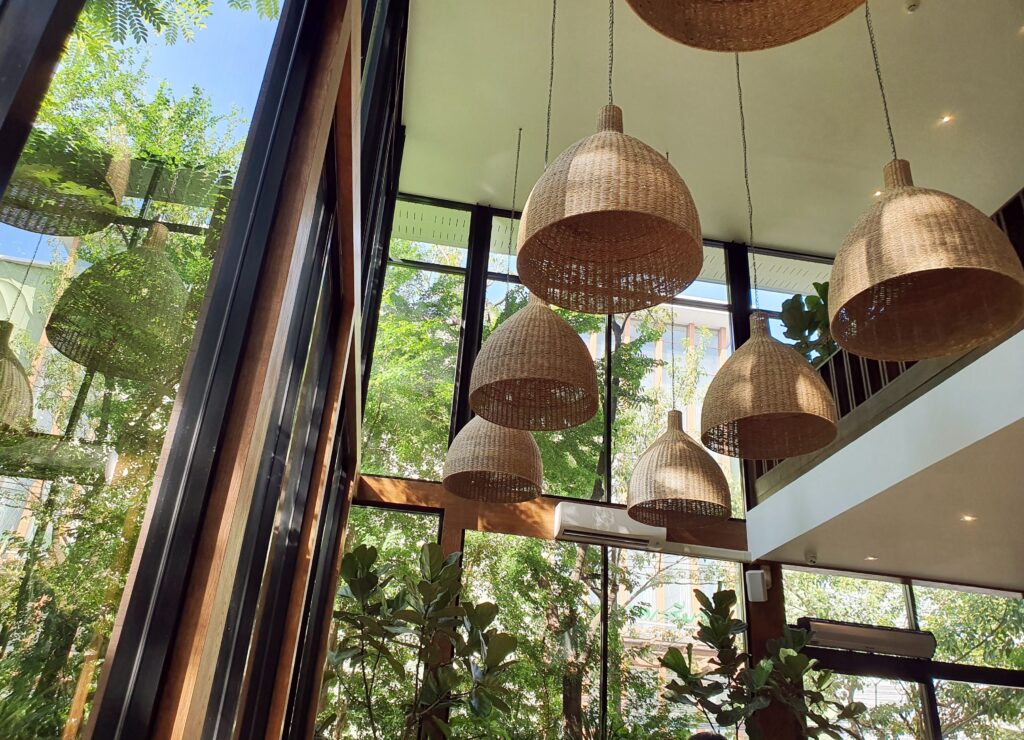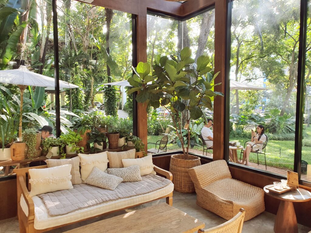 お店は緑に囲まれたグラスハウスに、最近流行りのラタンの家具が置かれていてかなり好みのスタイル。タイはお洒落でどこで写真を撮っても絵になるようなカフェがとても多いですがこちらのお店はPre-wedding Photoやガーデンスタイルの結婚式も出来そうな位の素敵空間でした。