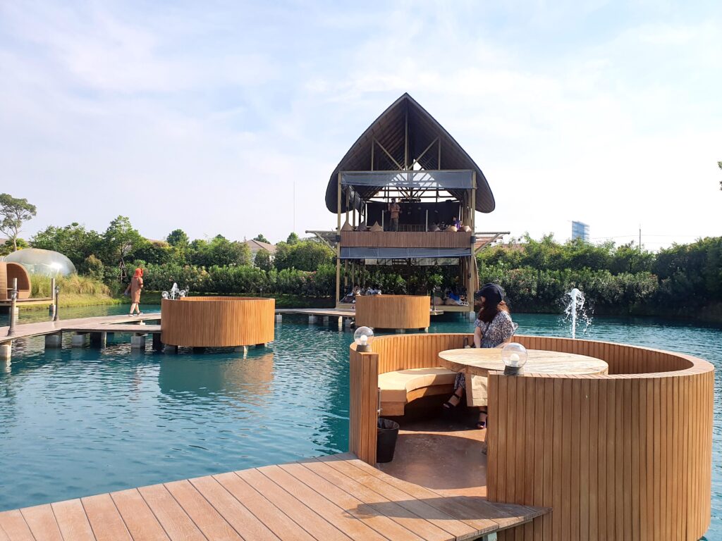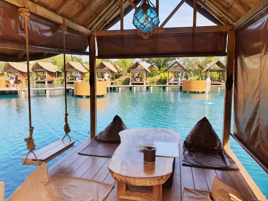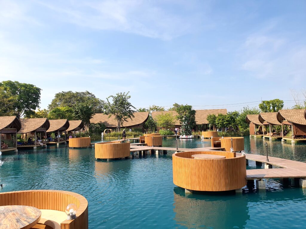 お店に着いたら店内に入る前の受付のようなところで、まず席を選びます。水近くの屋根あり個室席は最低注文金額が500バーツとなっていました。屋根がない席は17時からオープンのようで、ランチタイムは屋根ありの席のみの案内でした。水の近くでない場合は、最低注文金額は無かったので、サクッとカフェ利用の場合はそちらでも良いかもしれません。