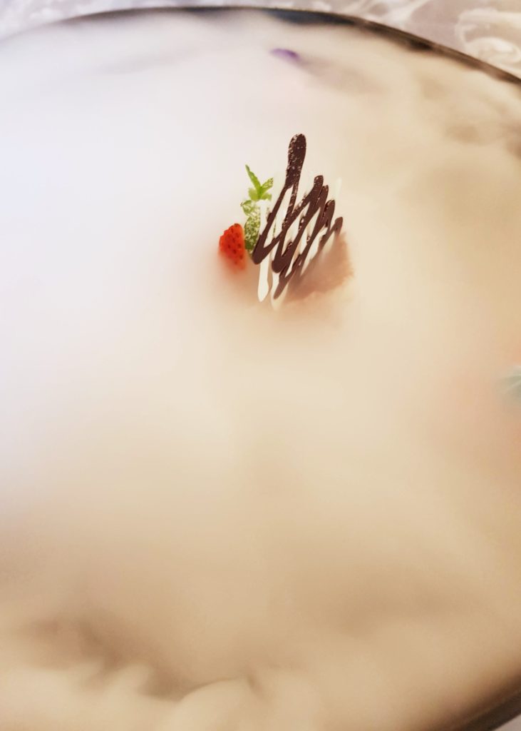 私のお気に入りはデザートのティラミスです。量はあまり多くないですが、ドライアイスの演出が素敵で味も美味しいです。