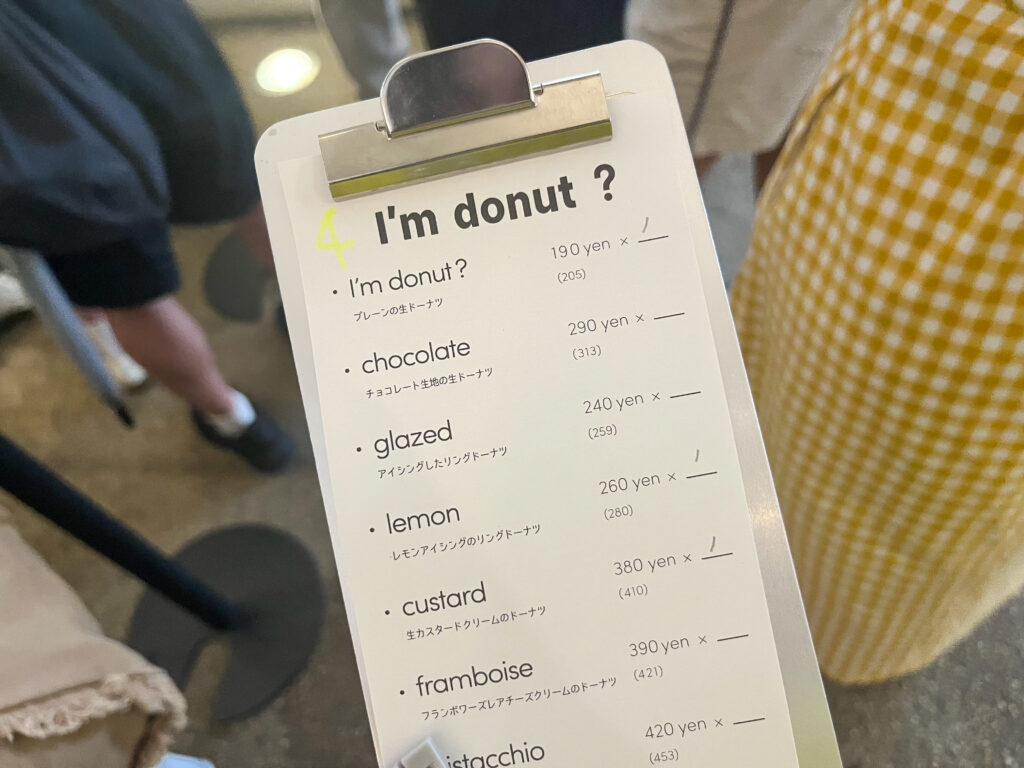会計が近づくとオーダーシートをもらうので、ここに購入するドーナツを記入。私はプレーン、レモン、カスタード、生ハムオリーブを選びました。