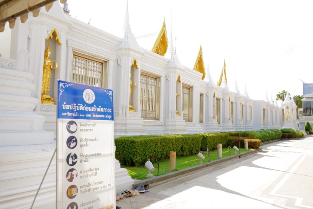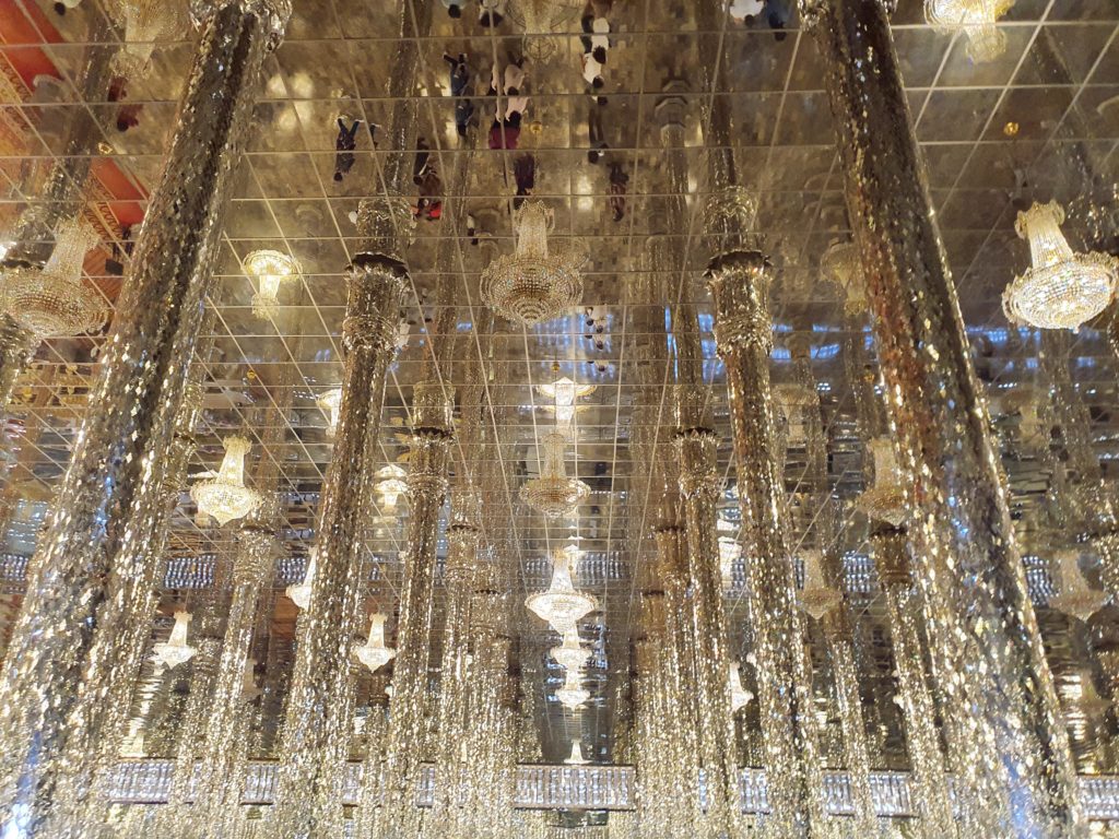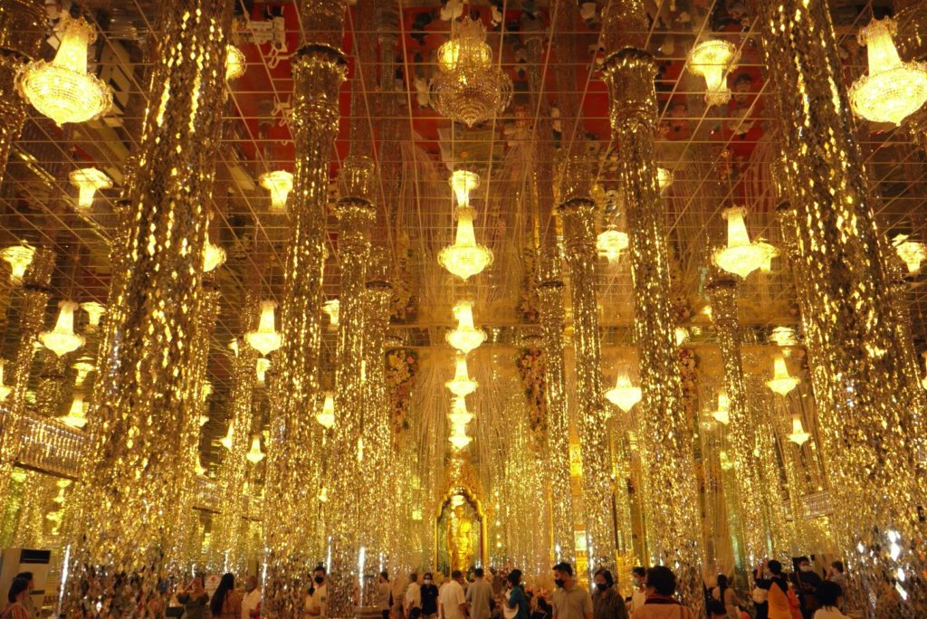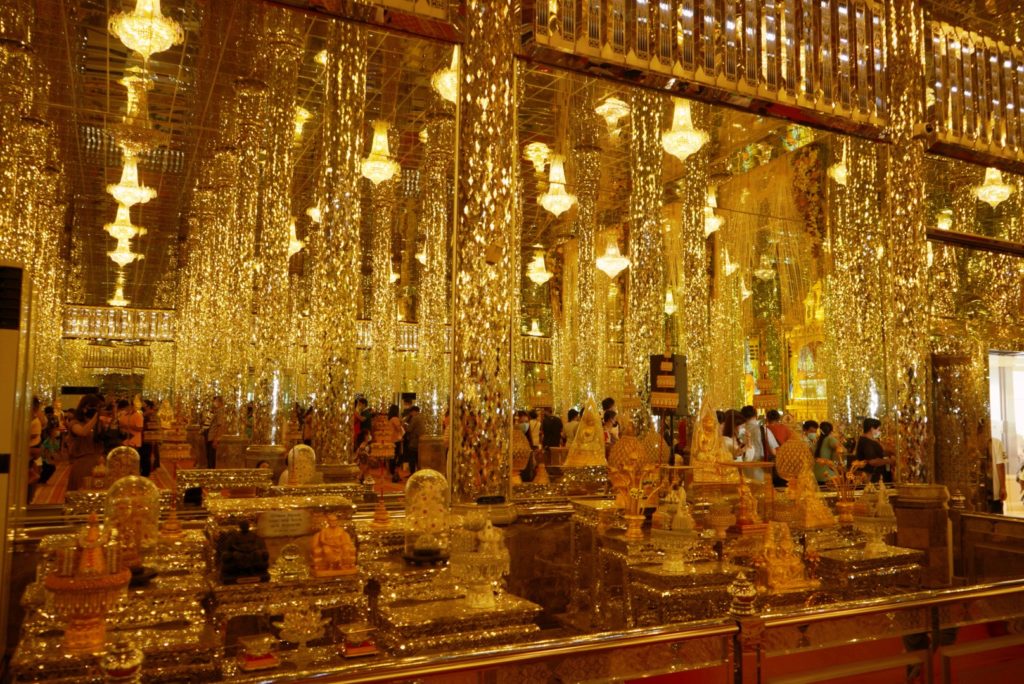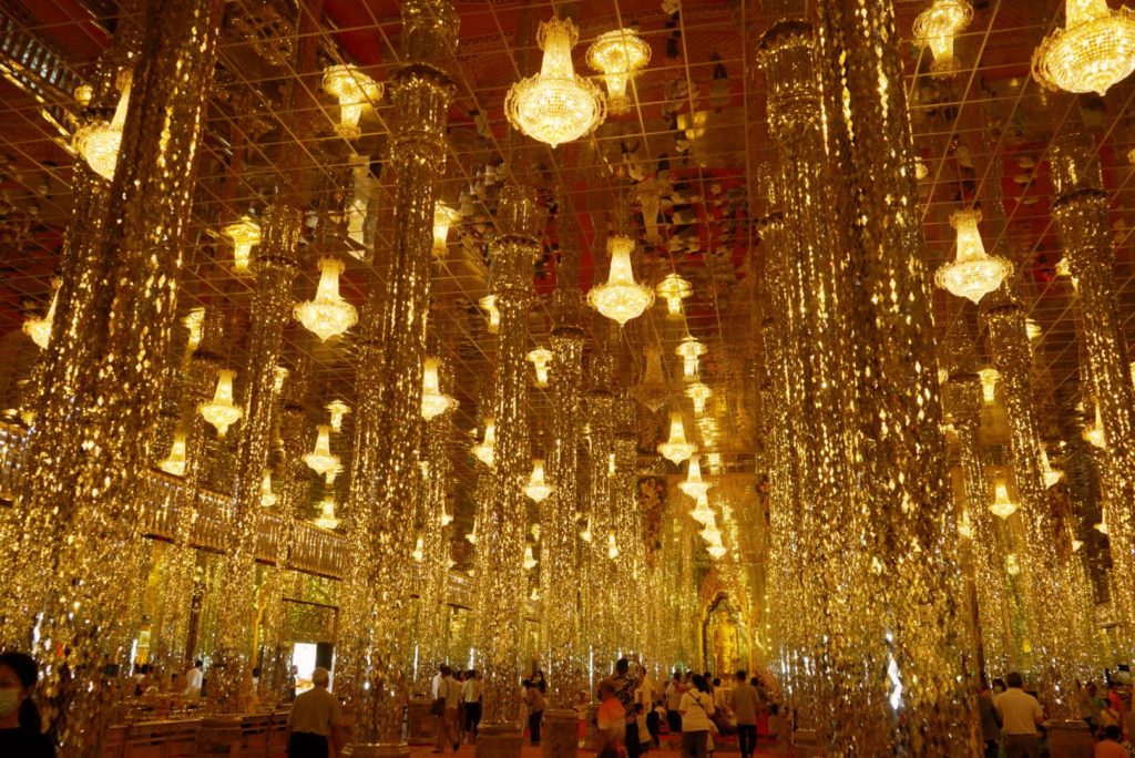 ここのお寺はアユタヤ時代に造られたもので、ガラスで飾られたインテリアとシャンデリア、壁に貼られた鏡に反射して映るガラスがかなり幻想的で美しい空間をつくり出しています。