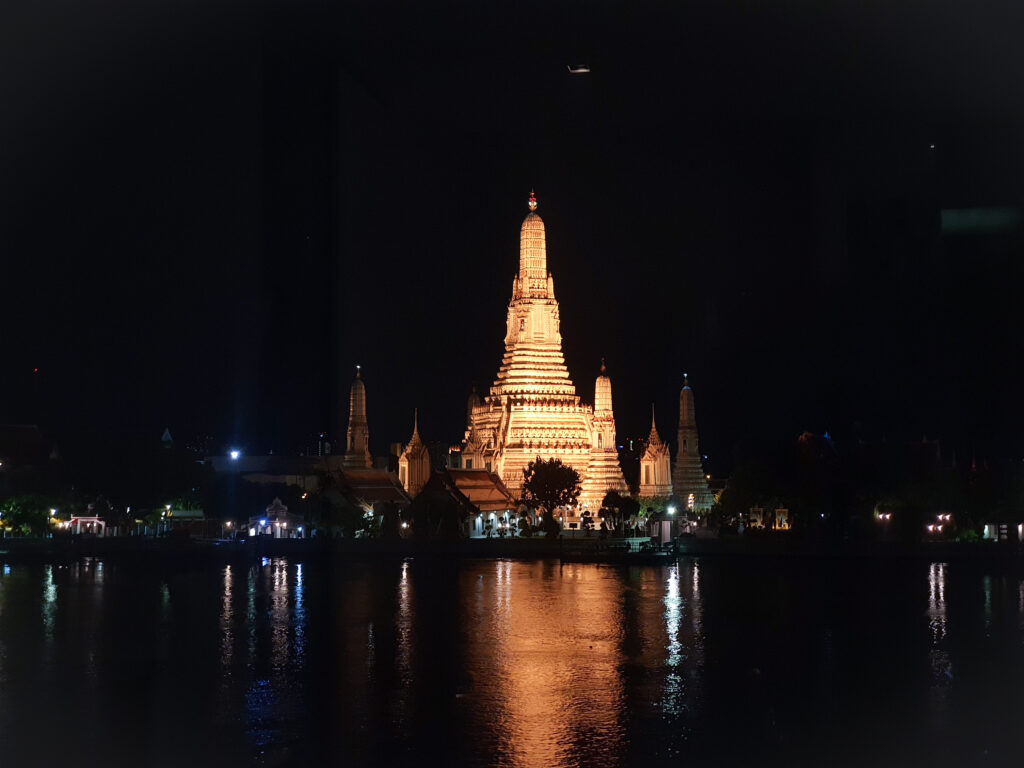 ワットアルンは夜中ずっとライトアップされているので、本当に窓の外を見ればこの光景があるのは夢の中にいるような気分になります。