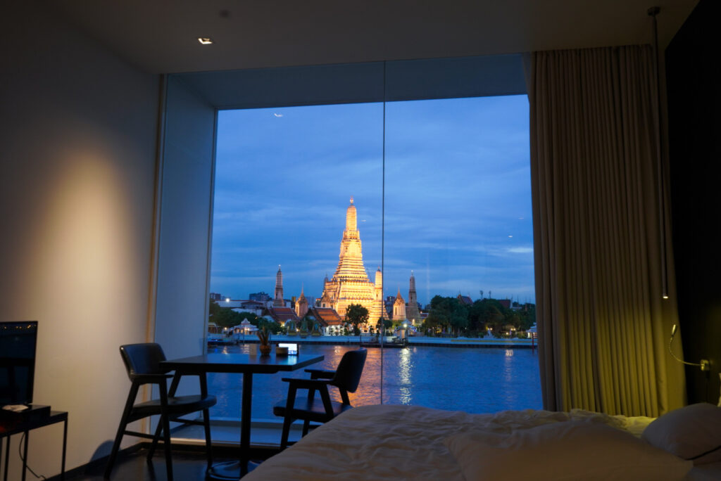 このホテルの一番のポイントは大きな窓と目の前に広がるワットアルンの美しさです。川沿いのステイケーションプランは、今色々なホテルから出ていますがこの美しさは断トツでした。
