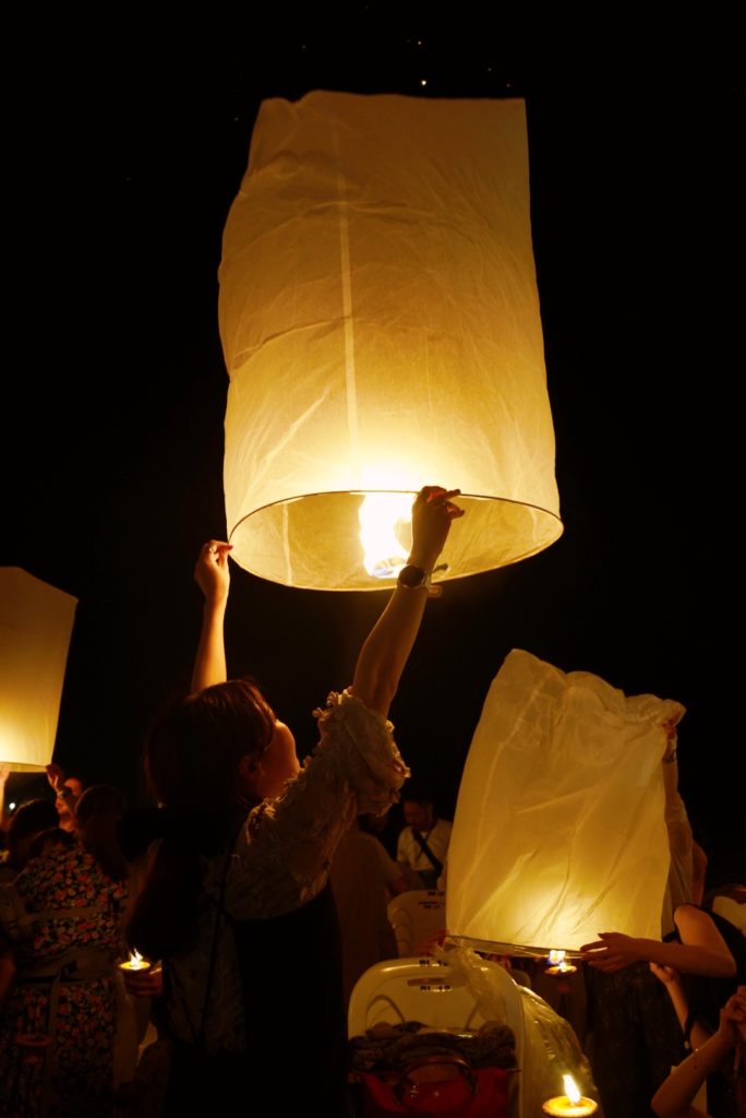 ランタンをあげる会場は狭く、その狭いスペースで火を使い空気を溜めて空にあげるので、安全面という意味では結構危険なイベントかなと思います。(実際近くにいた人たちはランタンに火が燃え移り、中々消す事が出来ずプチ火事でバタバタしてました。)なので余計なものは極力持たずに参加される事が良いかと思います。