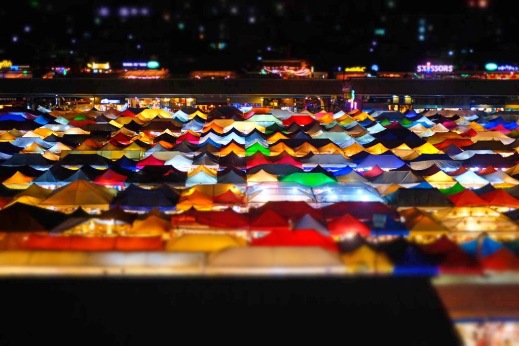 こちらのナイトマーケットは、MRTのタイカルチャーセンター駅(Thailand Culture Center)を下車し3番出口を左に進んだところにあります。Esplanadeというショッピングモールの裏側に位置しており、有名な上から見た風景はEsplanadeの駐車場(4階がベスト)から見る事ができます。