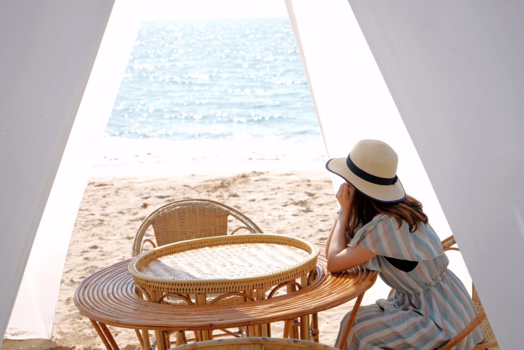 インスタ映え間違いなしの青と白を基調としたインテリアに、白いテントやブランコなどの写真スポットもあり食事だけではなく海沿いの散歩や写真も楽しむことが出来ました。