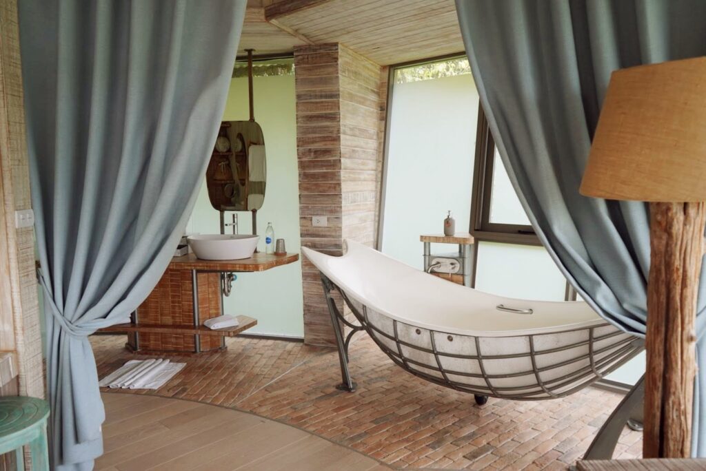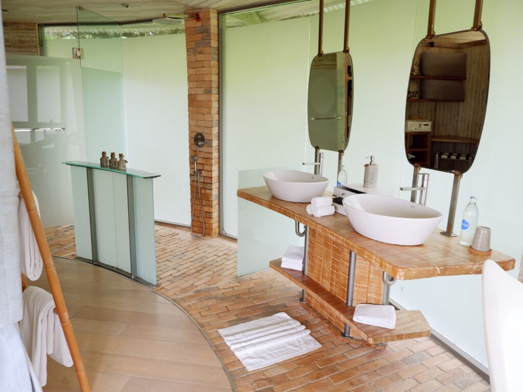 180度ガラス張りの部屋で外を見るたびにうっとりするような景色が目に入ってきます。2階はベッドとバスタブ、シャワーがあり、ベッドとバスルームエリアの部屋自体は分かれていませんでしたが、カーテンで区切ることが出来たので良かったです。