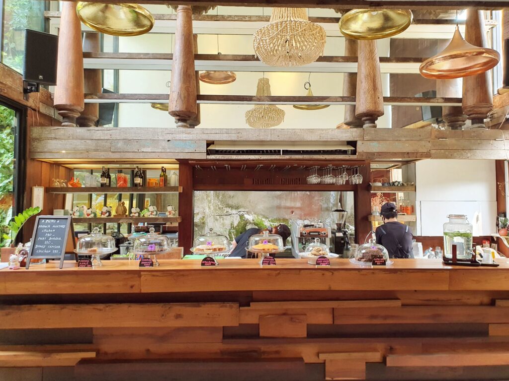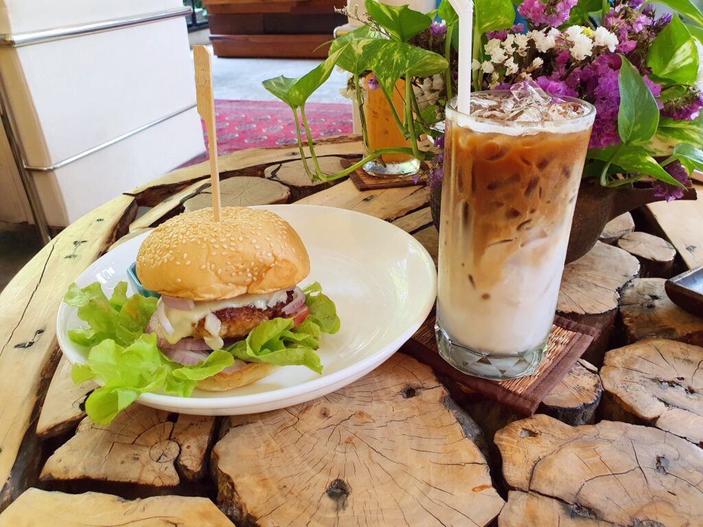 注文したのはマストトライと書いてあったバーガーとドリンクは無難にカフェラテ。お値段は二人分で680バーツ(約2,400円)でした。店内は広くはないですが天井が高く自然光が綺麗に入り込んでくる作りになっていてとても素敵な雰囲気でした。