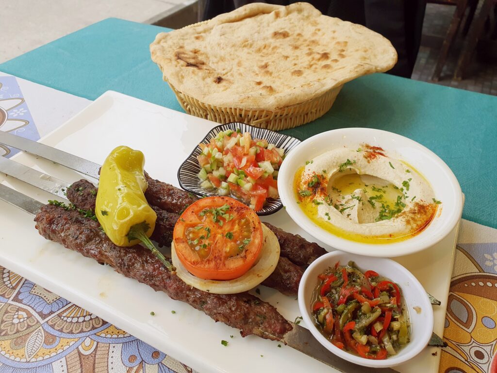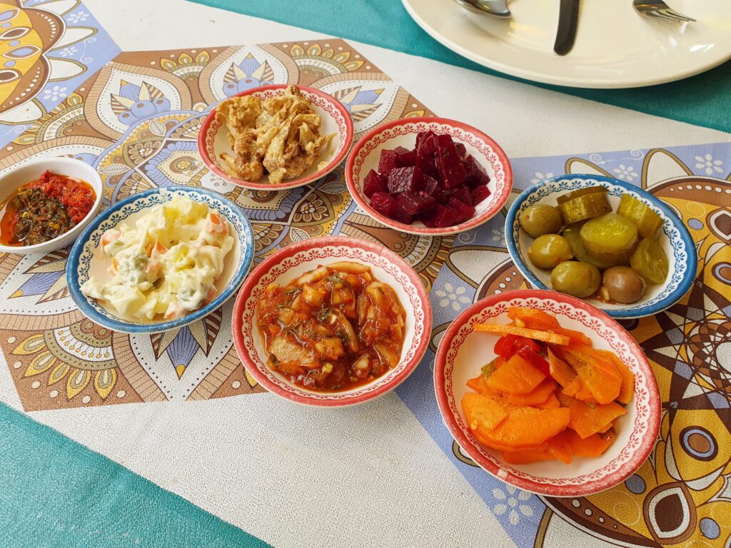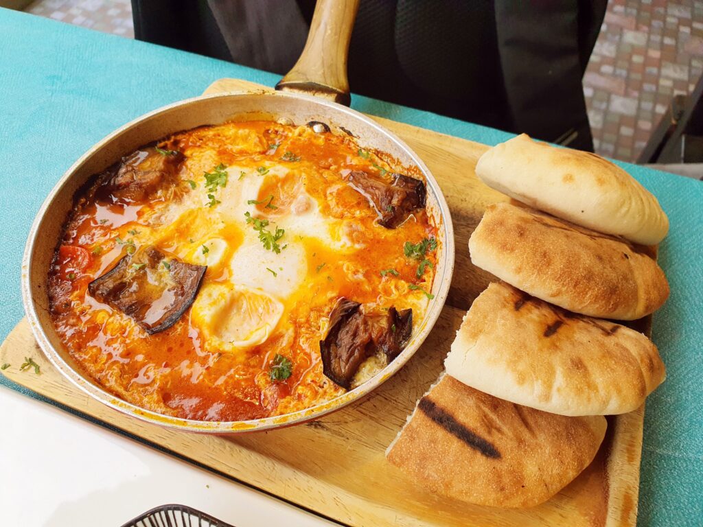 注文したのは「プレーン・シャクシュカ」と「ラム肉のBBQ」。この2品に前菜がたくさんついてきて、3人で結構お腹いっぱいになる量でした。