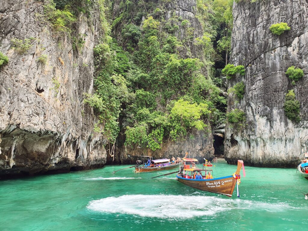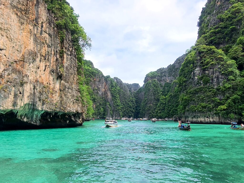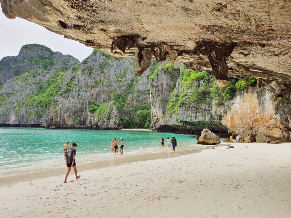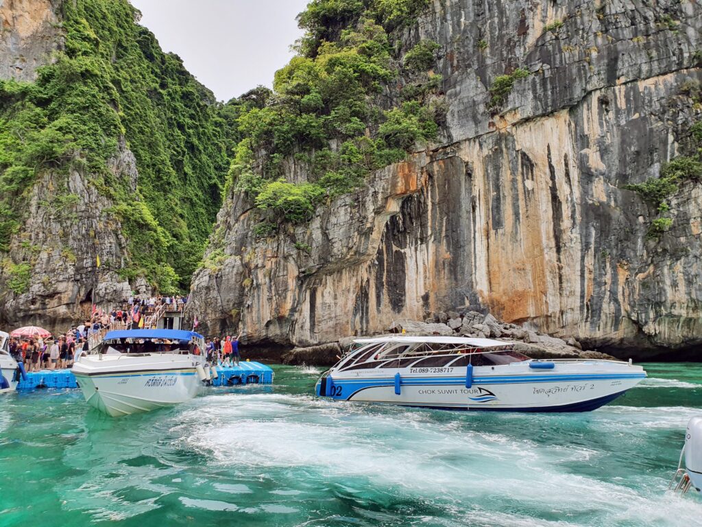 マヤベイは「The Beach (ザ・ビーチ)」という映画の舞台になった島。観光保護のため2021/12までずっと閉鎖されていましたが2022/01から入場者数を制限して再開。その為、1回に入島できる人数も限られていてツアーごとの予約制になっているようです。