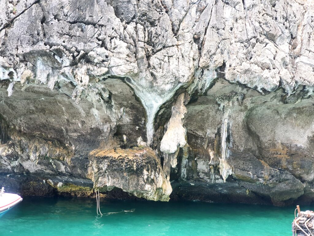 ご飯の後は、メインのピピ島 マヤベイへ。途中、船に乗りながら私有地の島の解説や船の上から写真を撮ったり出来るポイント(モンキービーチや洞窟など)に立ち寄ったりしながら向かいます。
