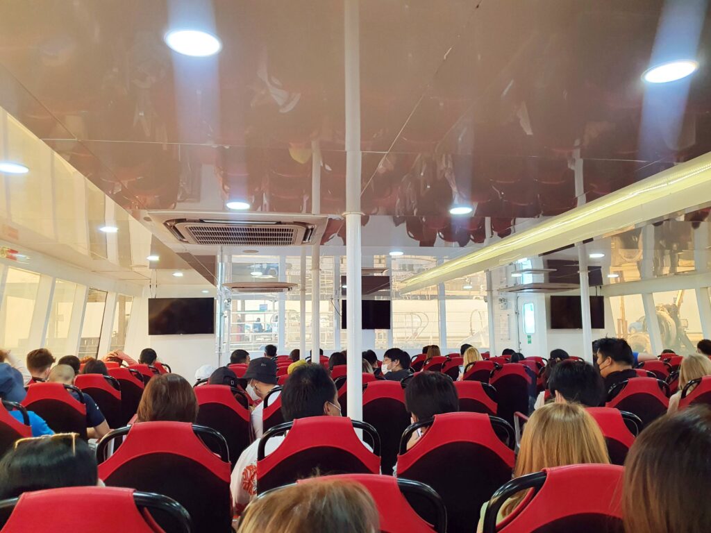 駐車場に車を停めた後、ワクチン接種証明書の提示と乗船名簿の記載を行い受付へ予約確認書を乗船券へ交換しました。長期連休の為かかなりお客さんが多かったです。