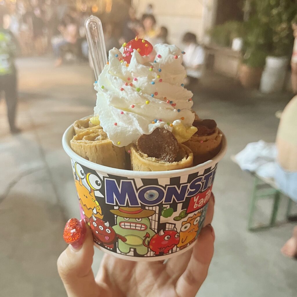 タイ発祥のロールアイスや、串焼き、フルーツスムージー等ちょっと食べたいものが集まっていて、いつ行っても楽しむことが出来ます。時間も深夜00:00頃までやっているので遅い時間帯まで遊べる場所の1つです。