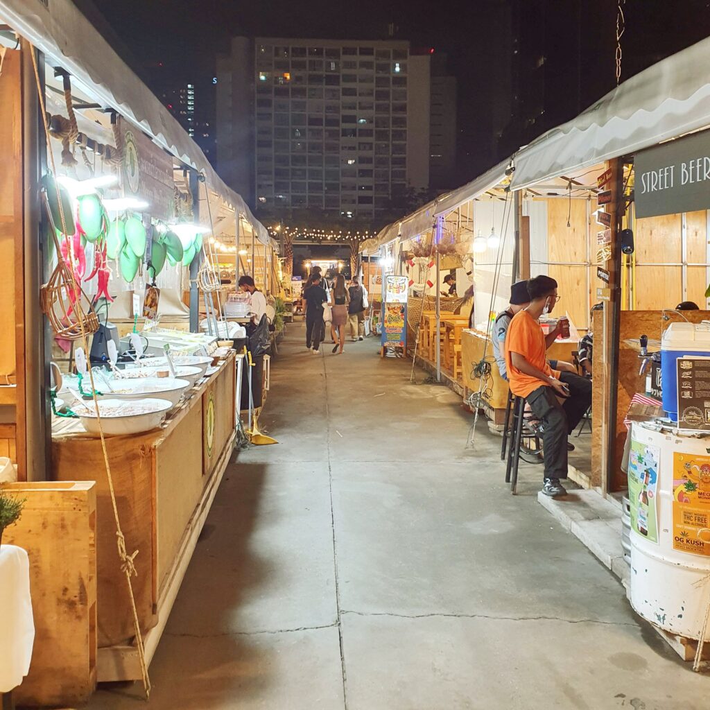以前は、カラフルなテントが有名な「ラチャダーナイトマーケット」がこの近辺では有名でしたが、パンデミックの時にこのナイトマーケットは無くなってしまって今はこちらのナイトマーケットがタイ人や在タイ者、また旅行客の方からとても人気の場所になっていてたくさんのお客さんで賑わっています。