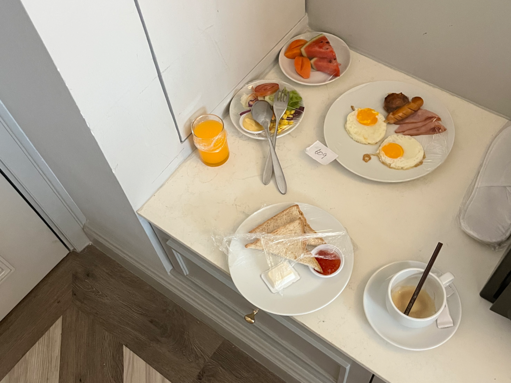 朝食は隔離中のため、チェックイン時に伝えた希望の朝食(洋食かタイ料理かと飲み物が選べたような気がします。)が部屋まで運ばれてきます。