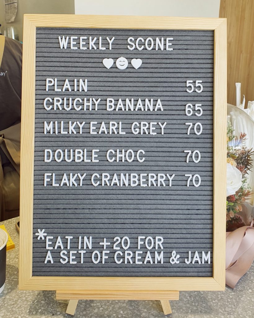 ในวันที่ฉันไปนั้น มีสโคน 5 รสชาติให้เลือก และมีเมนูพิเศษฉลองเปิดร้าน ในชื่อ สตรอเบอรี่ คลัมเบิล โดยราคาขอสโคน และเครื่องดื่มนั้น ต่างก็เริ่มต้นที่ 70 บาทโดยประมาณ ถือได้ว่าไม่แพงนัก ที่สำคัญฉันว่ากาแฟของที่นี้รสชาติดีเลยทีเดียว
