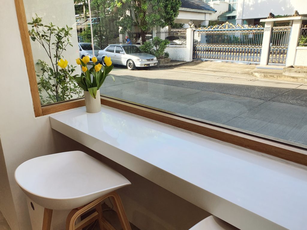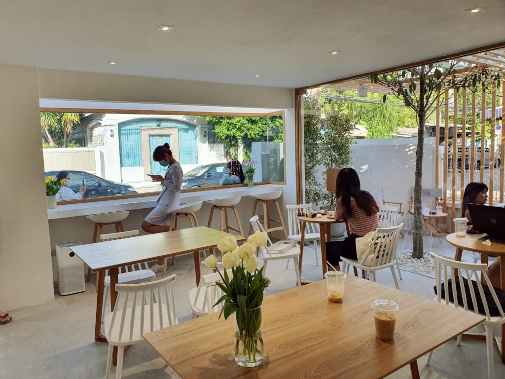 ตัวร้านจะเป็นสีขาวเรียบ ๆ ตัดกับสีน้ำตาลจากไม้ ทั้งภายในภายนอก ภายในร้าน เมื่อเข้ามาจะพบได้ว่าไม่ได้กว้างมากแต่ไม่แคบ ฉันว่ากำลังอบอุ่นดีนะ ภายในร้านมีโต๊ะสำหรับนั่งทาน 4 โต๊ะ เคาท์เตอร์ และ ม้านั่ง รวมกันประมาน 10 ที่นั่ง และมีโซน ด้านนอกให้นั่งได้อีก 4 โต๊ะ บรรยากาศเรียบง่ายมาก ๆ เลยล่ะ